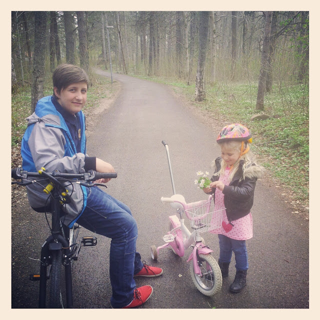 Sen va det dax för en promenad. Vi mötte upp brorsan och gick för att köpa glass...sen tog vi en liten extra promenad. Vädret va så skönt! Isolde plockade vitsippor som jag nu hittade under vagnen.